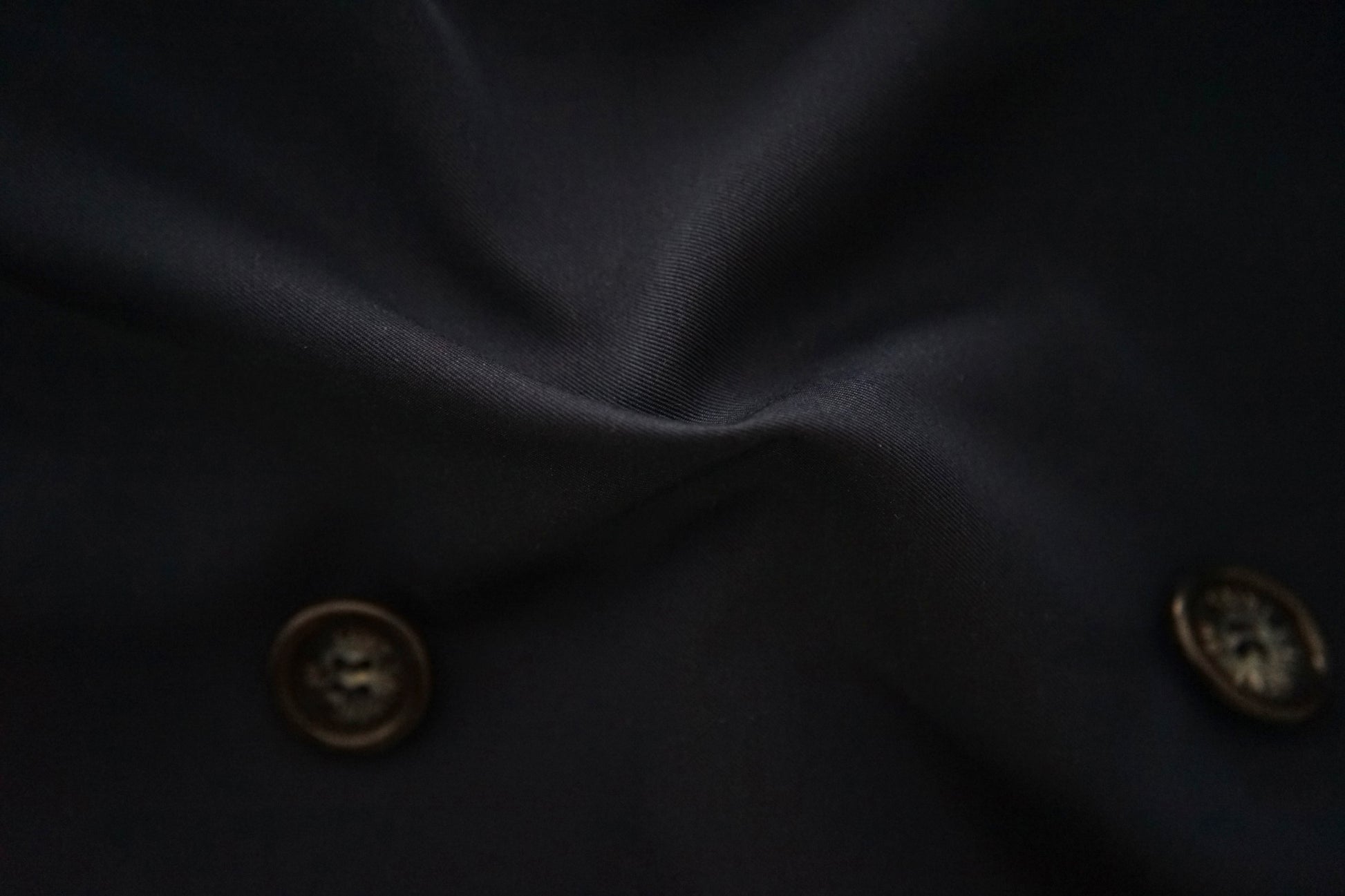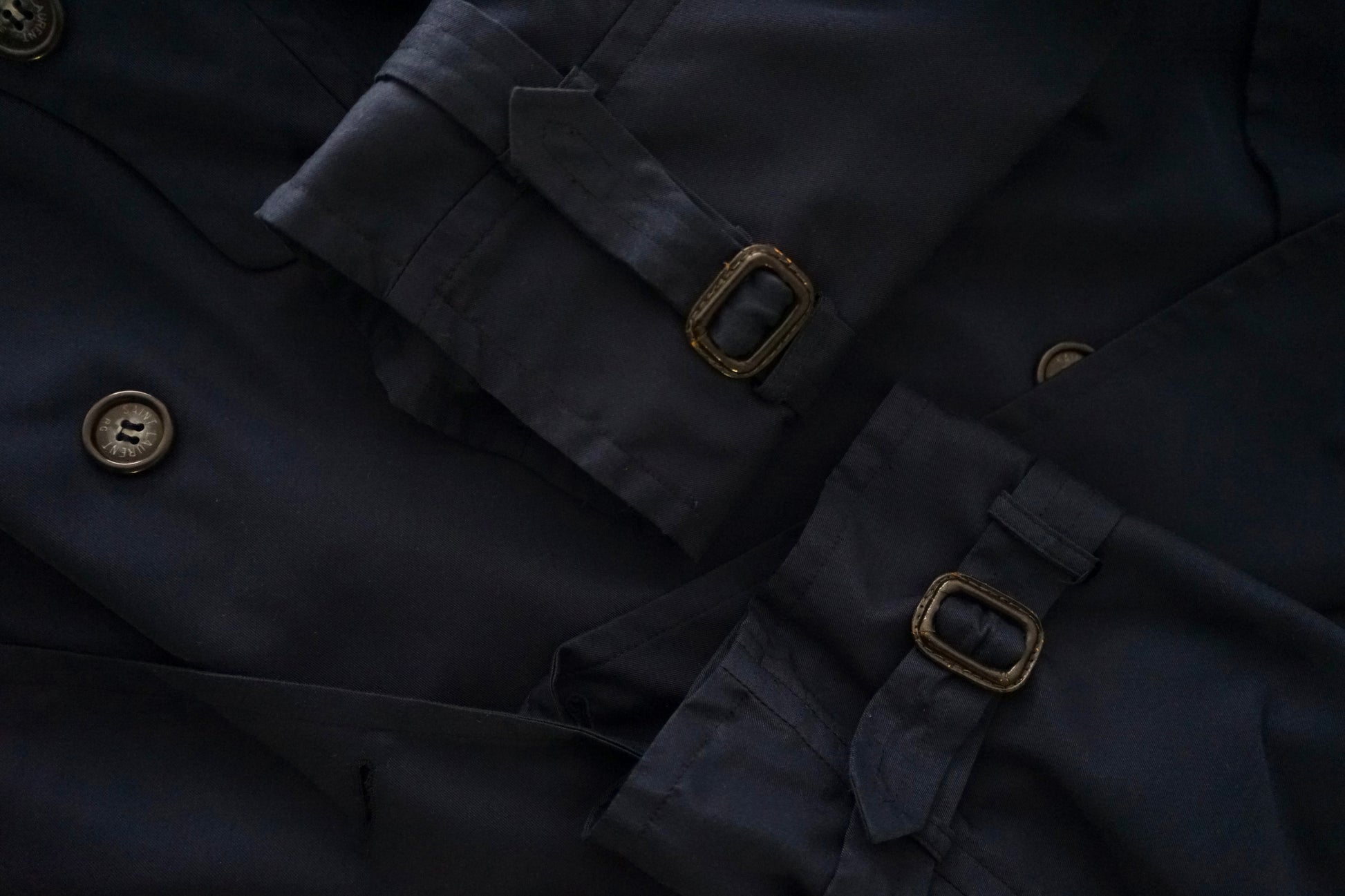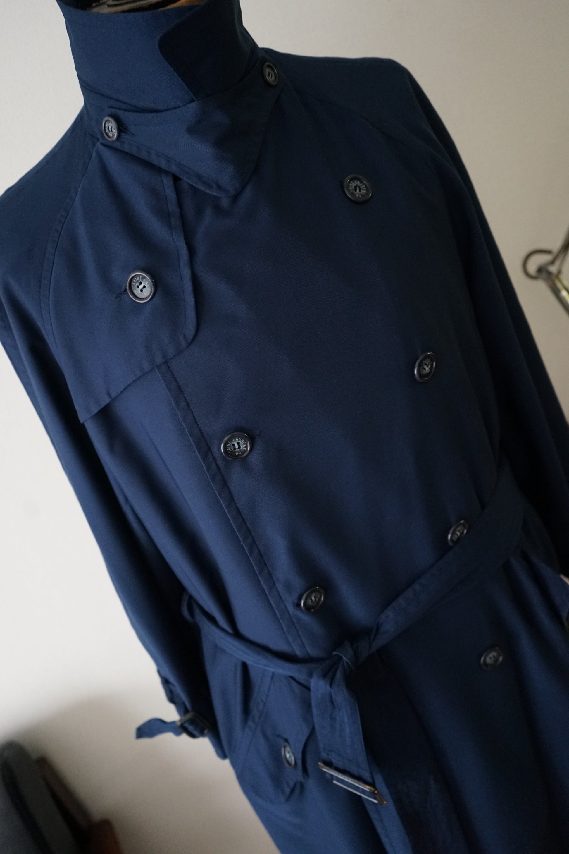 こちらは深いフレンチブルーが美しい、ポリエステル100%のトレンチコート。