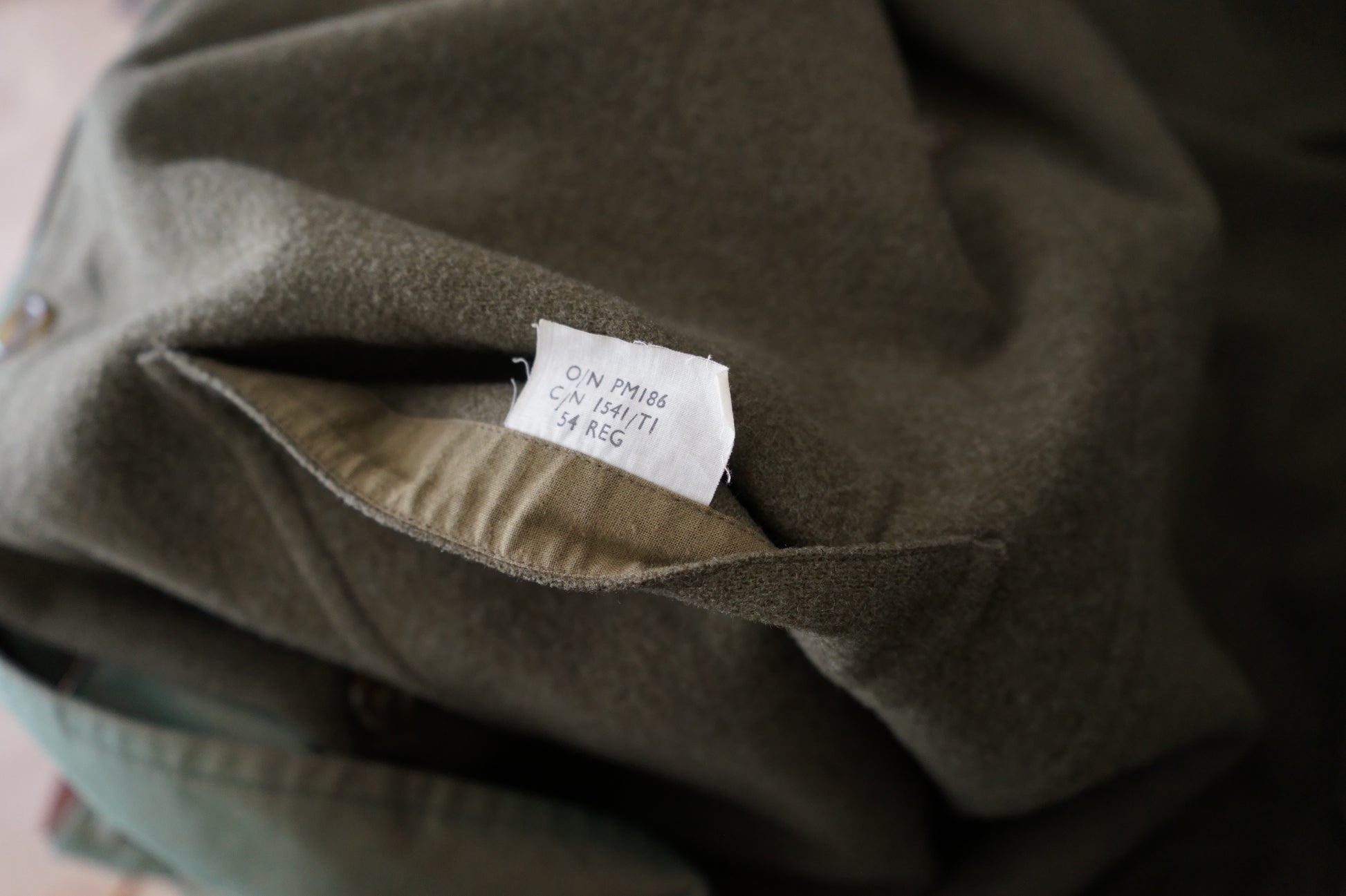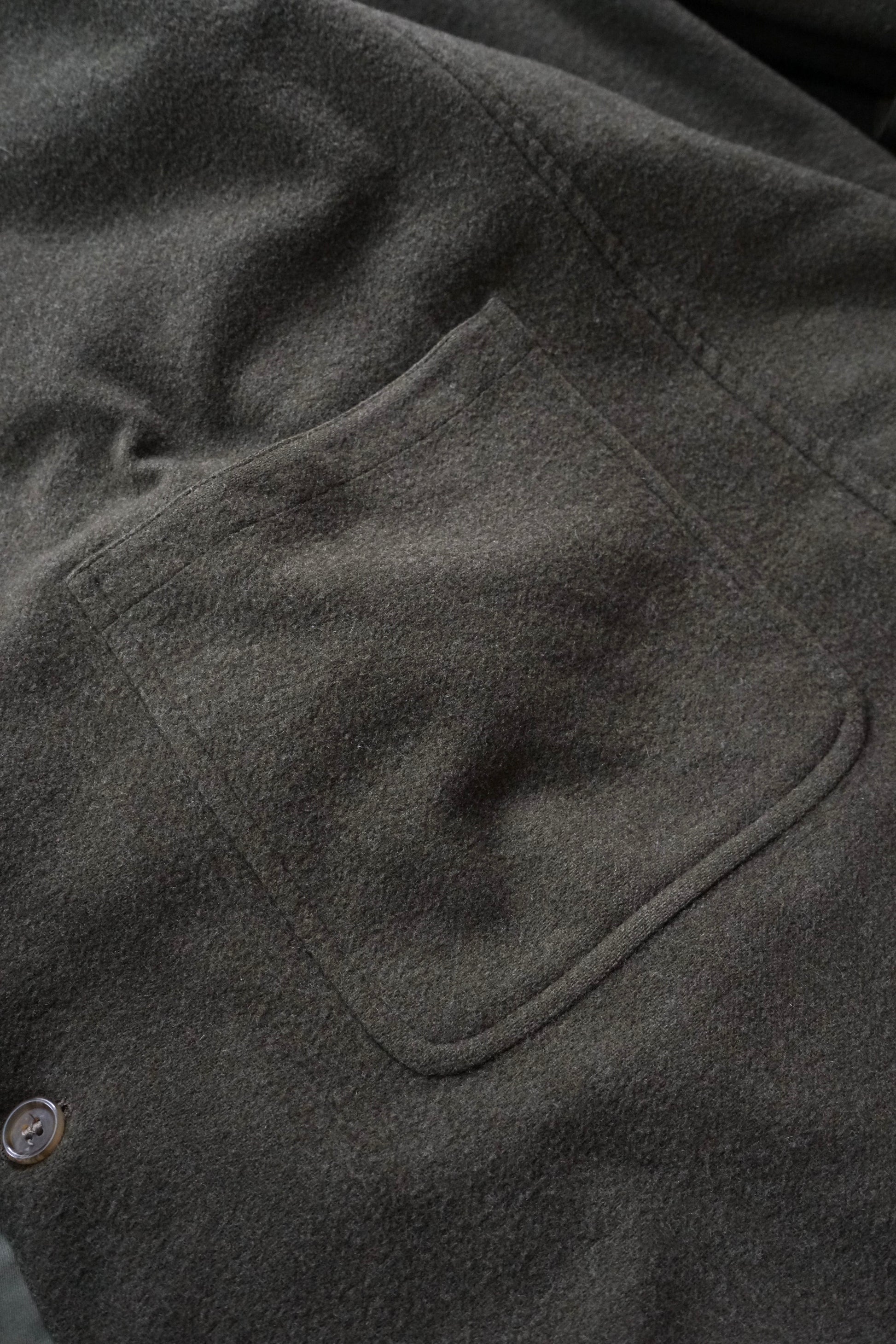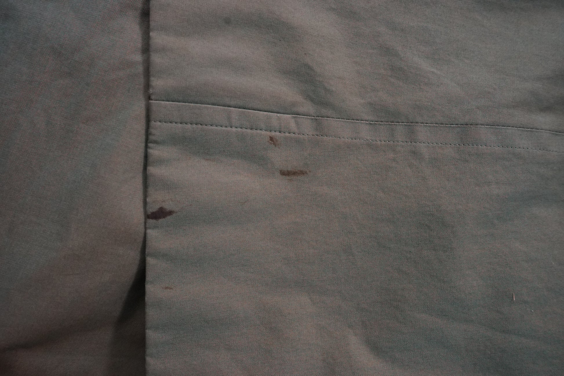 縦糸にオレンジ、横糸にグリーンが使用されることで光の当たる角度によって見え方の変わる生地なので、裾に向かってブワッと広がるAラインのシルエットとベルトによって生まれる生地のドレープ感によって生まれるシルエットこそ、このコートの真髄だと思います。