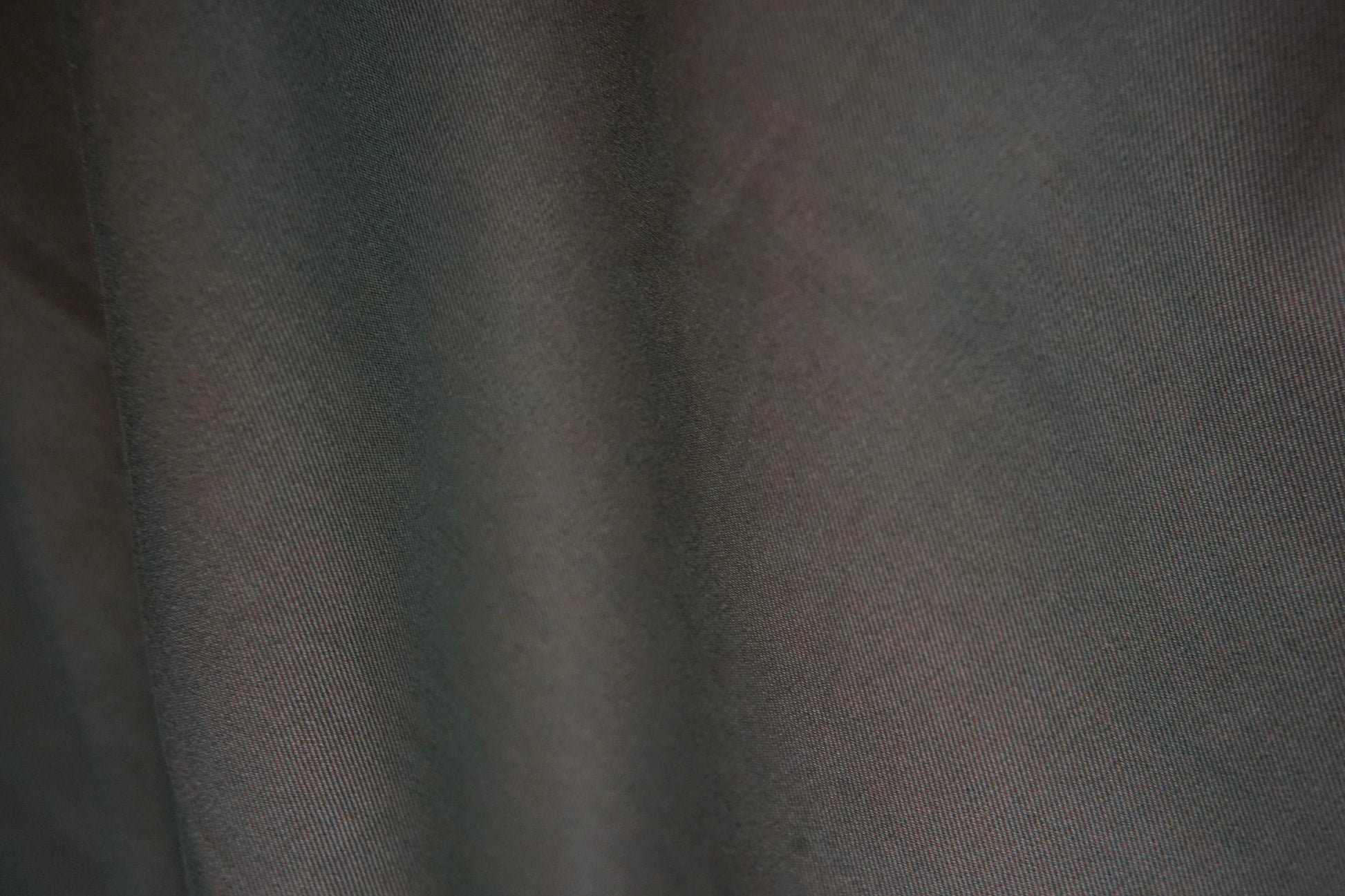 エレガントな深みのある玉虫ギャバジンを贅沢に使用し、たっぷりとした生地量をベルトでギュッと縛る。