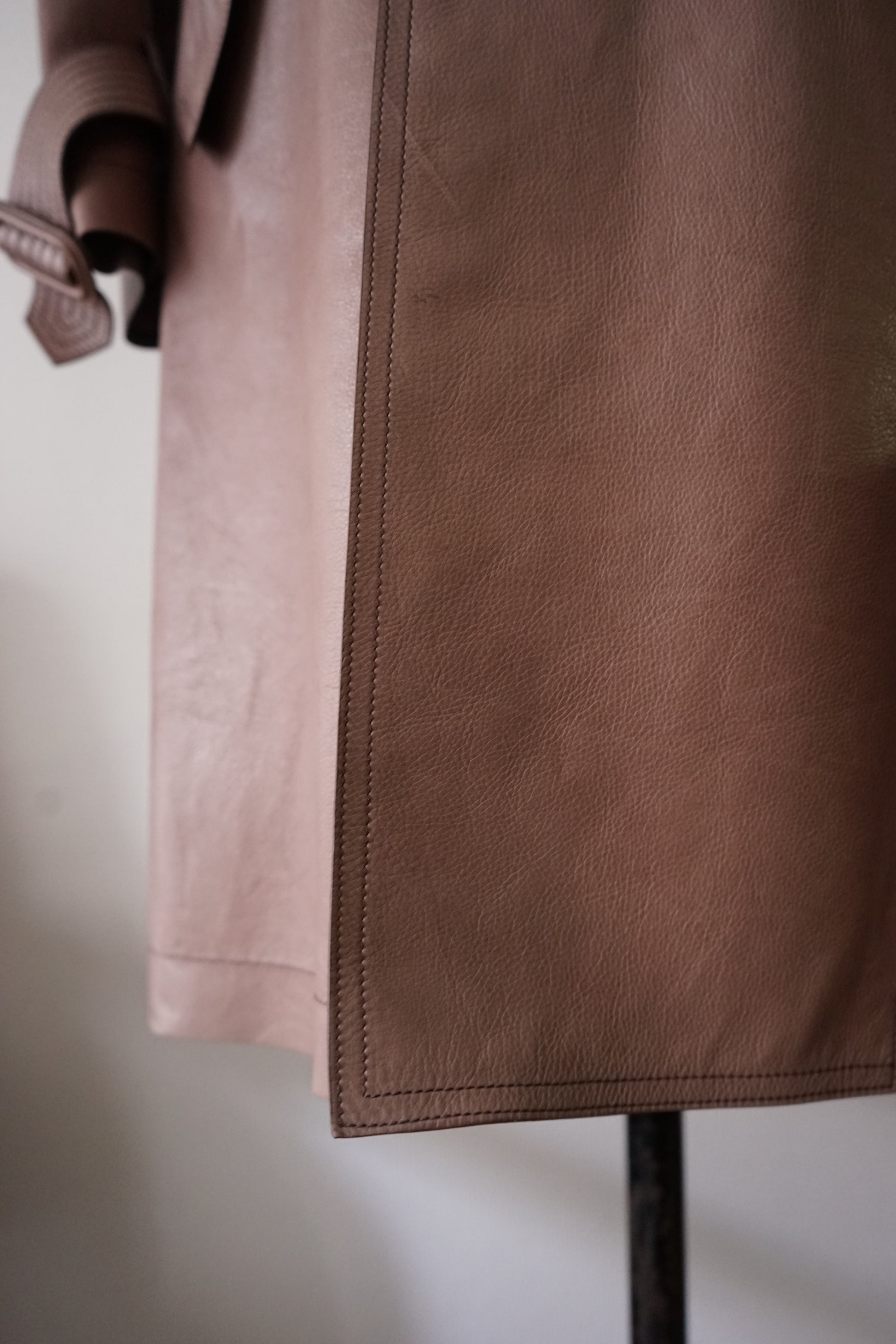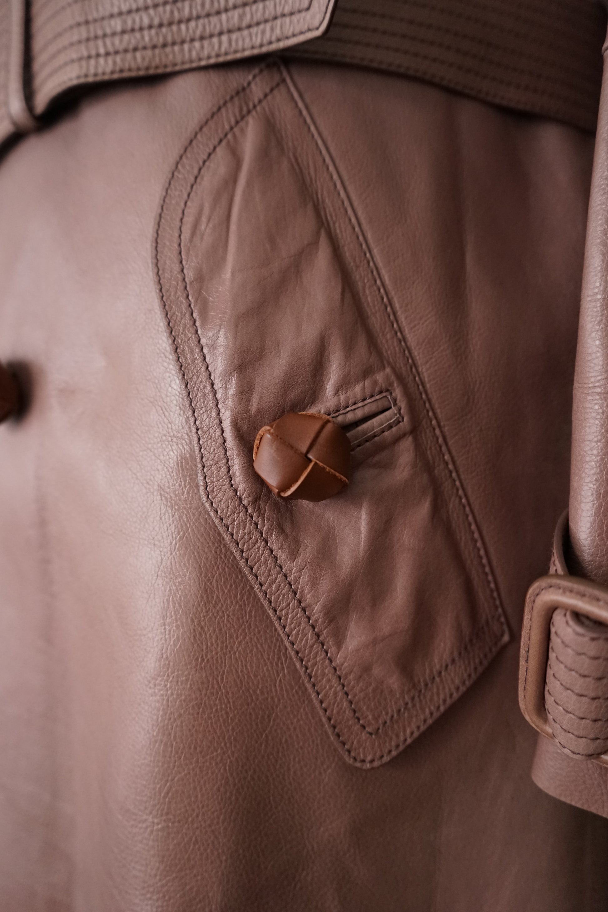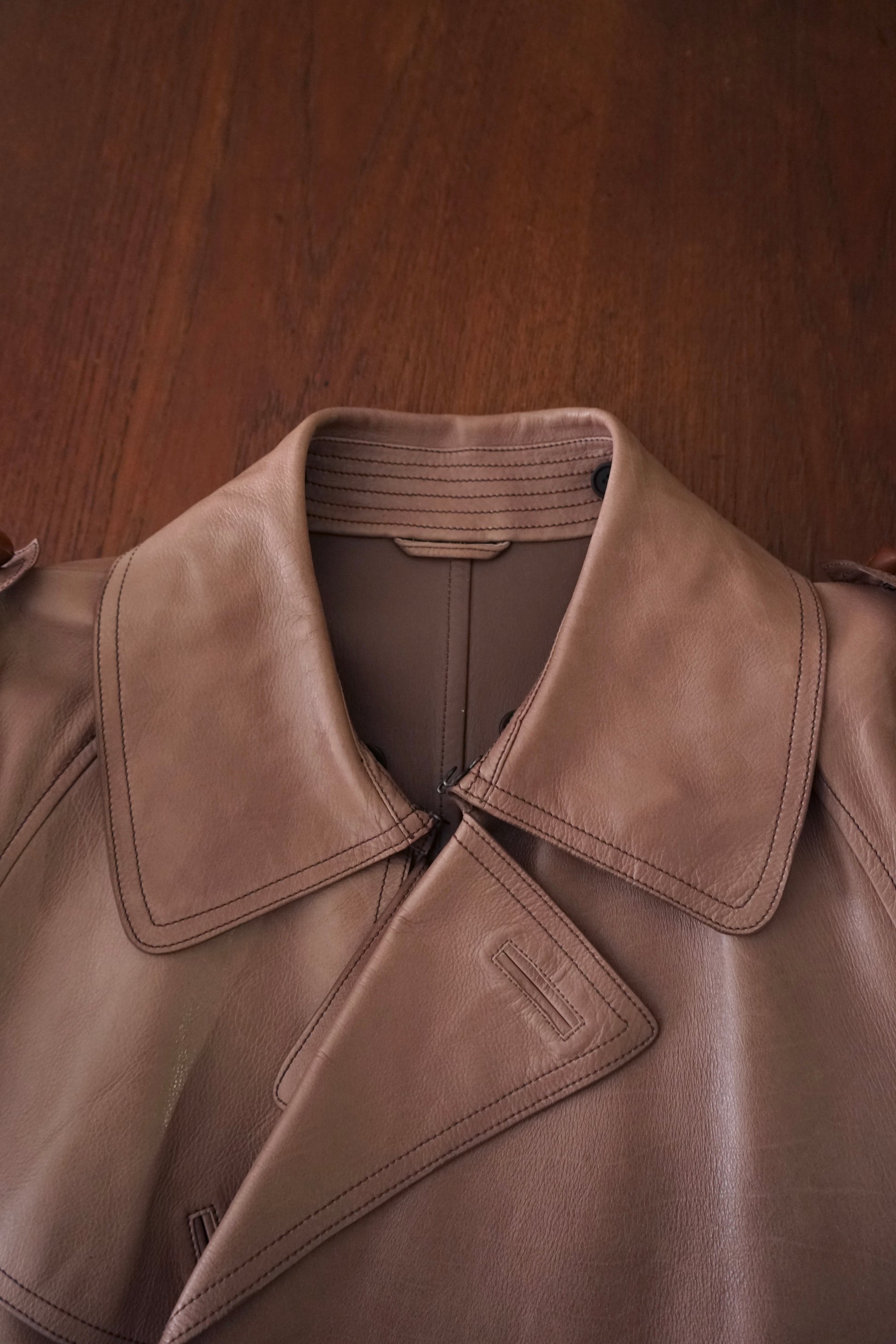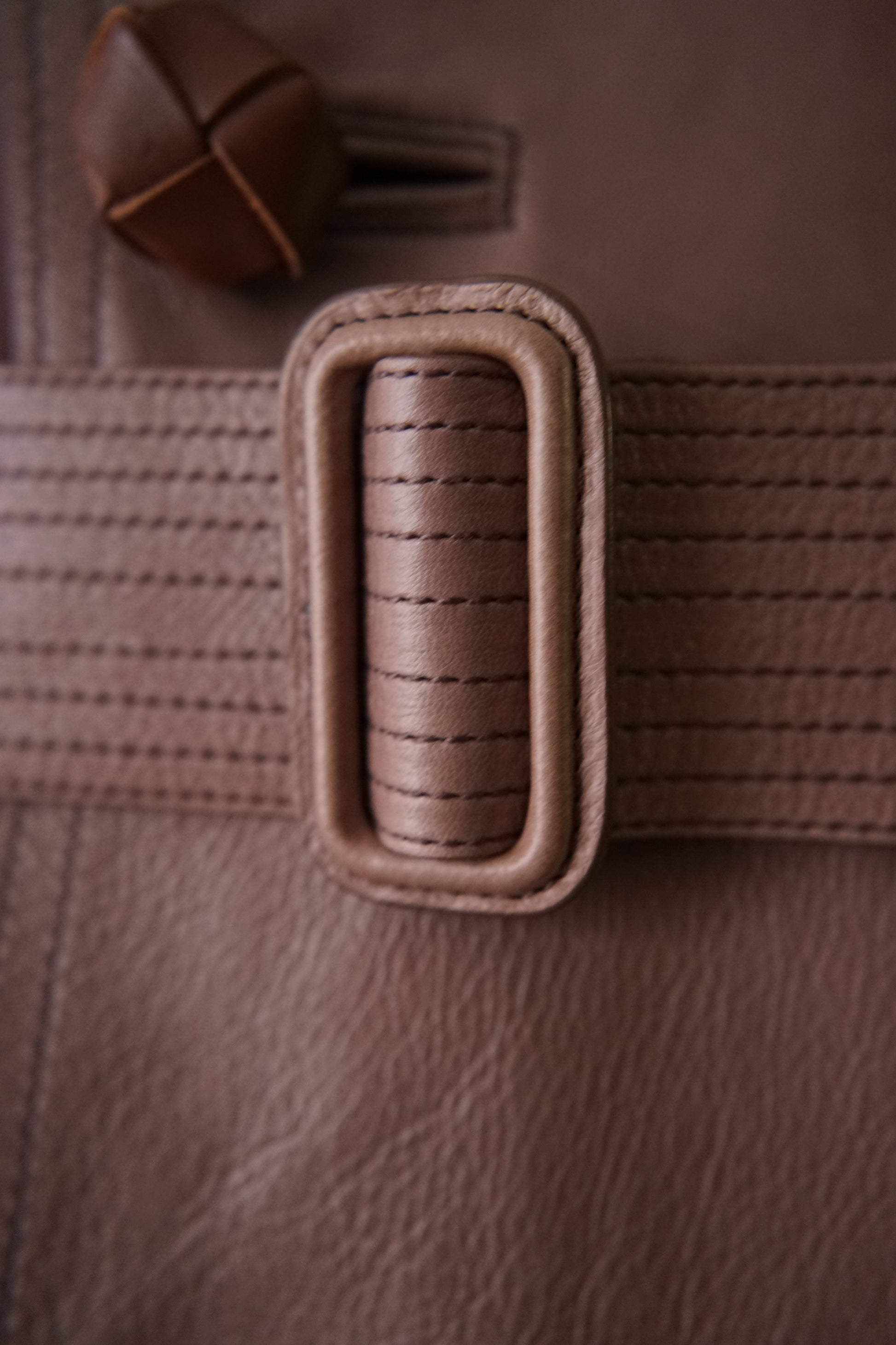 ナッパラン加工と呼ばれる、スエードやムートンなどの毛皮の裏面(床革面)に樹脂加工を施し、まるで革の表面(銀面)のように仕上げた加工のオールレザーのトレンチコート。