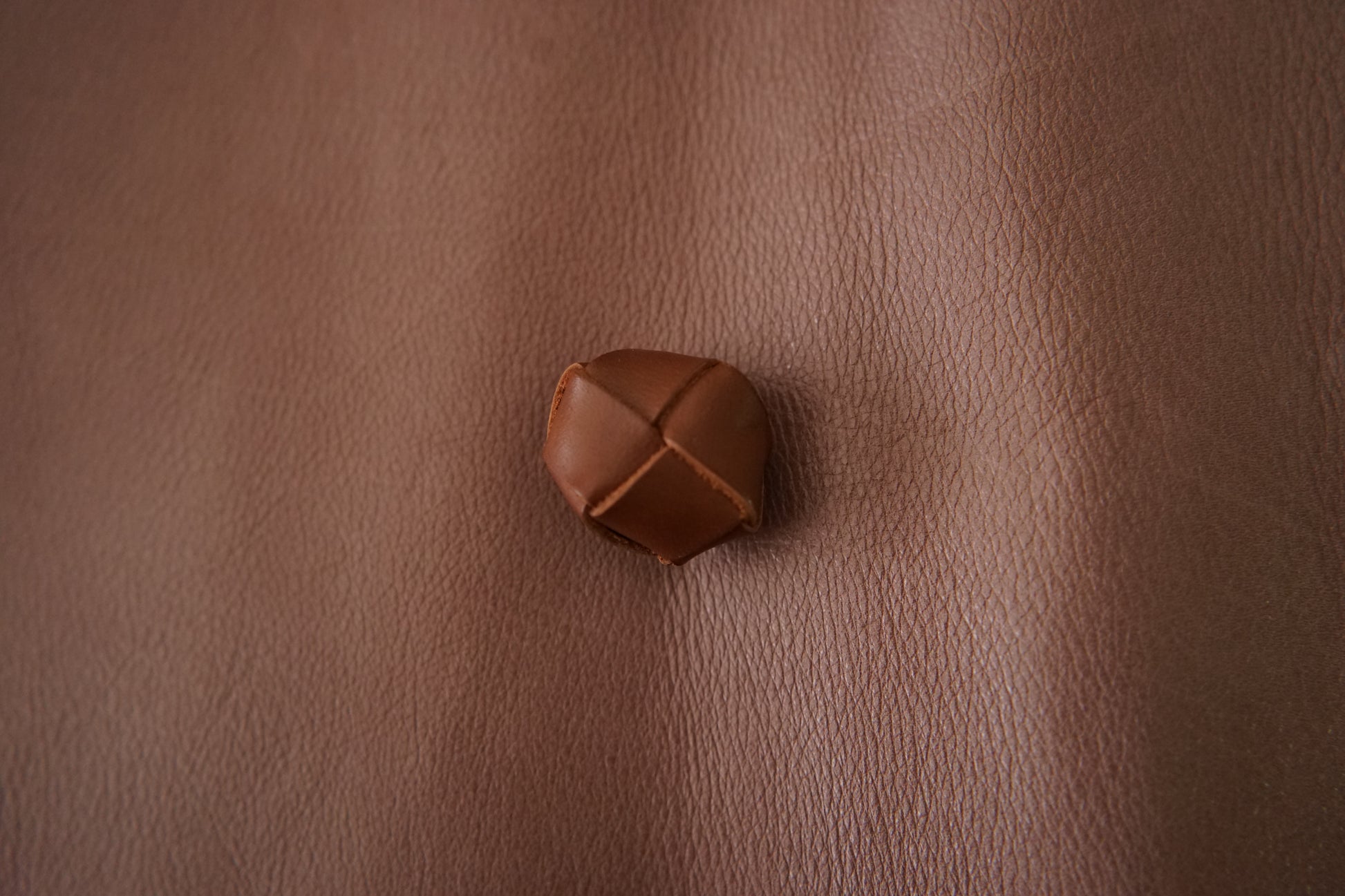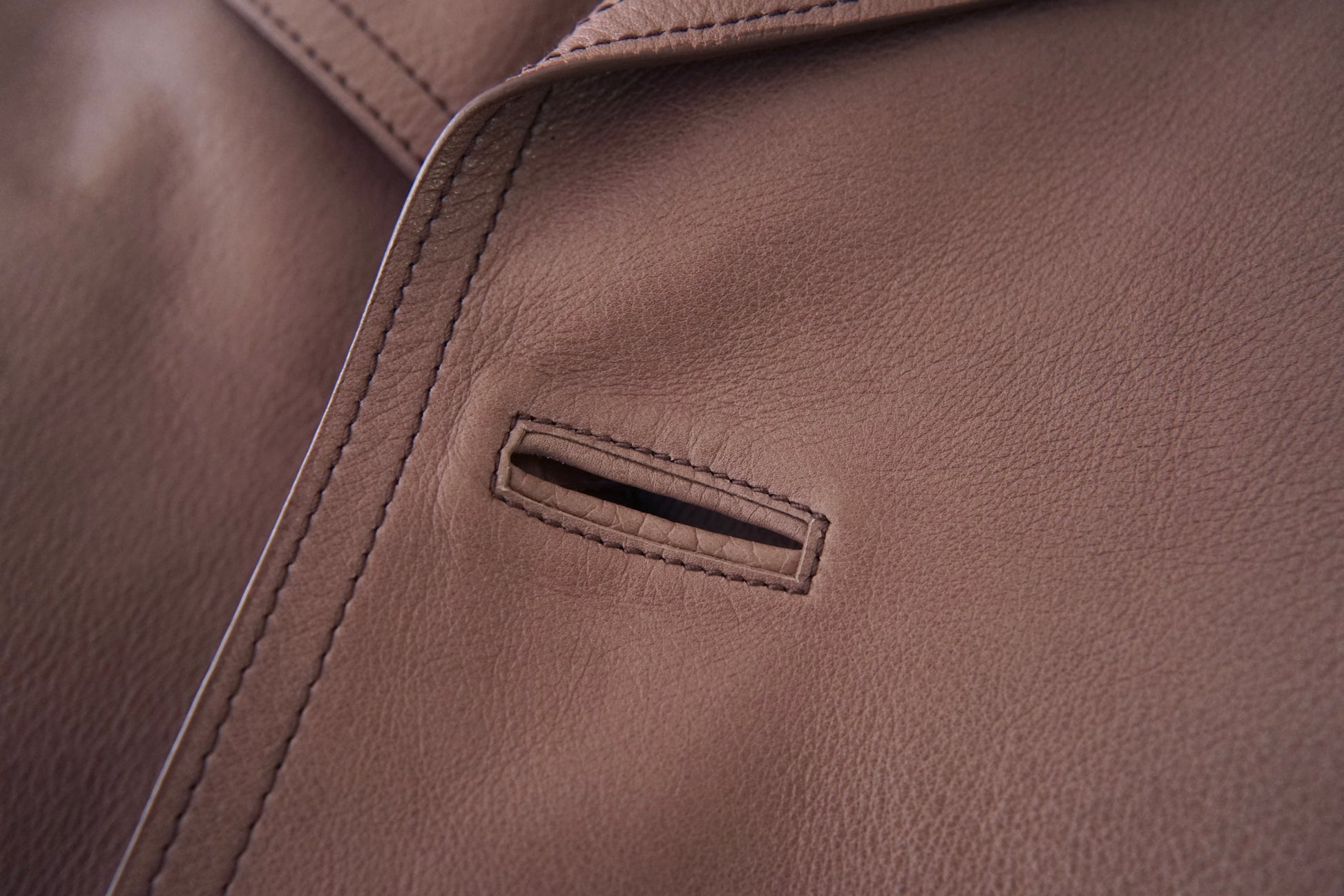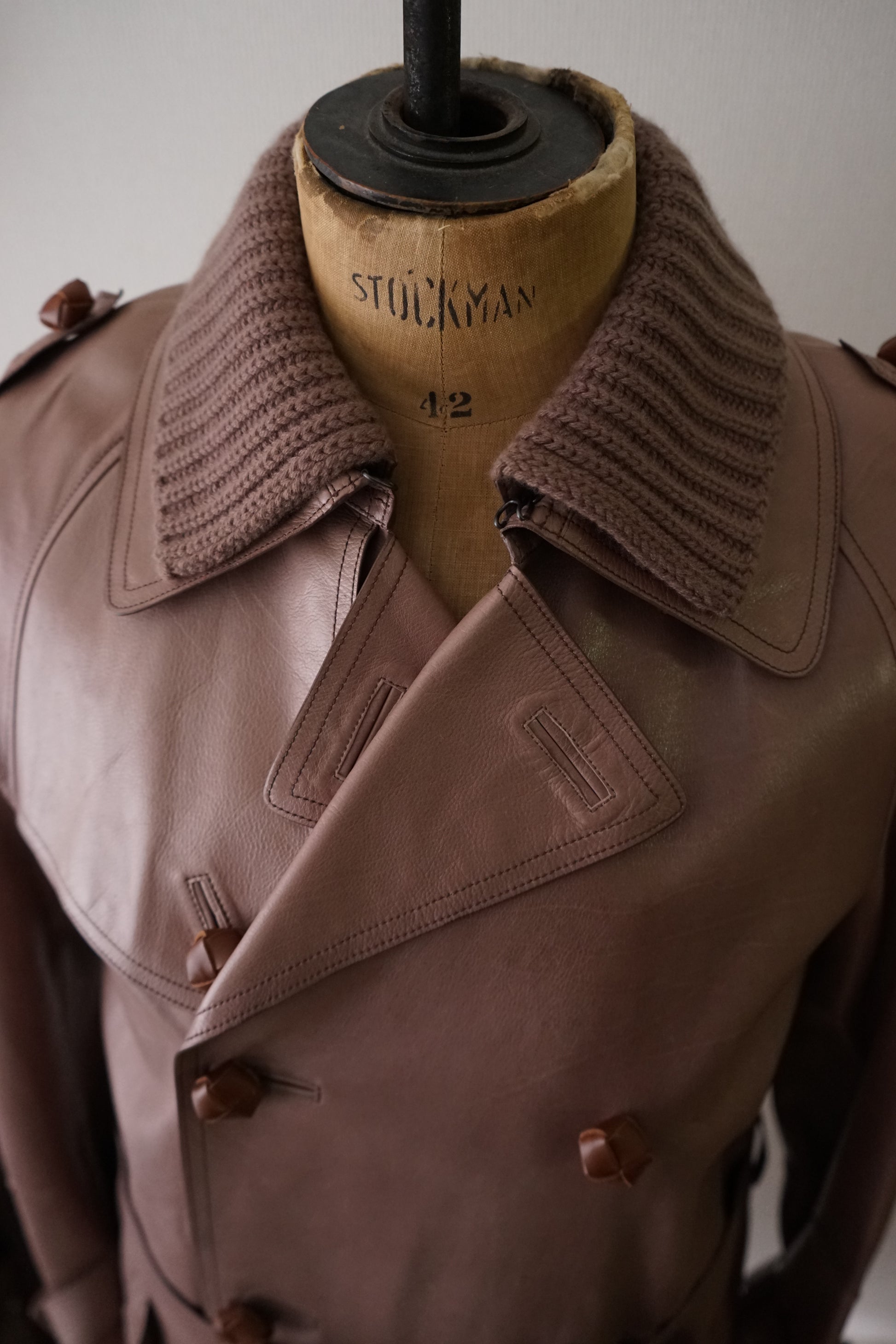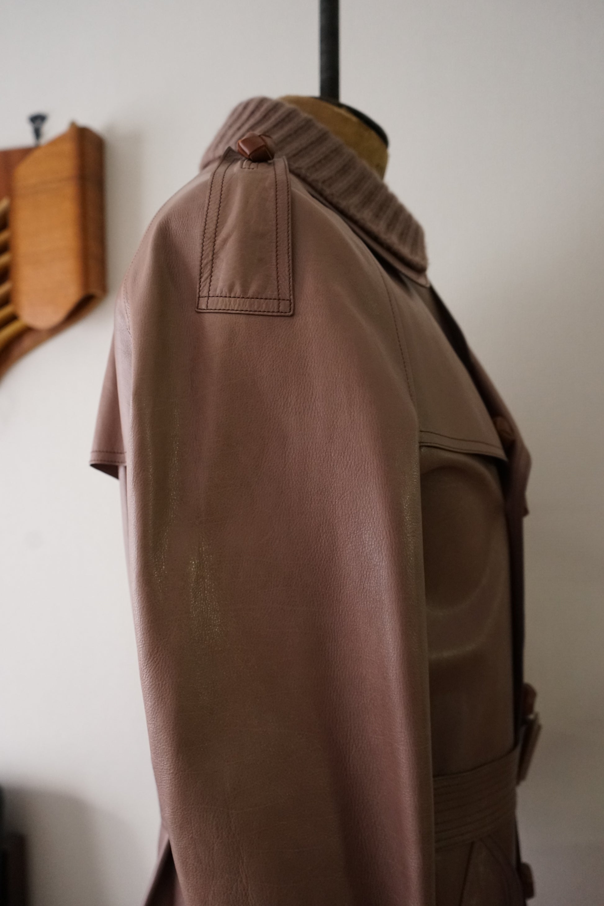 ナッパラン加工と呼ばれる、スエードやムートンなどの毛皮の裏面(床革面)に樹脂加工を施し、まるで革の表面(銀面)のように仕上げた加工のオールレザーのトレンチコート。